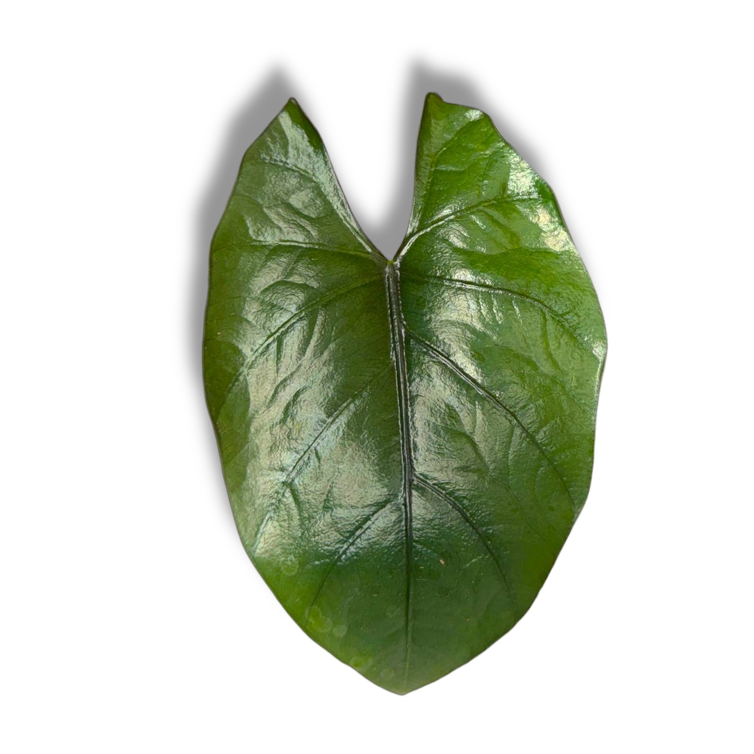 Alocasia Dark Miri — компактная алоказия с плотными, почти бархатными листьями насыщенного тёмно-зелёного цвета. При определённом освещении поверхность уходит в графитовый оттенок, а светлая центральная прожилка делает форму листа ещё выразительнее.