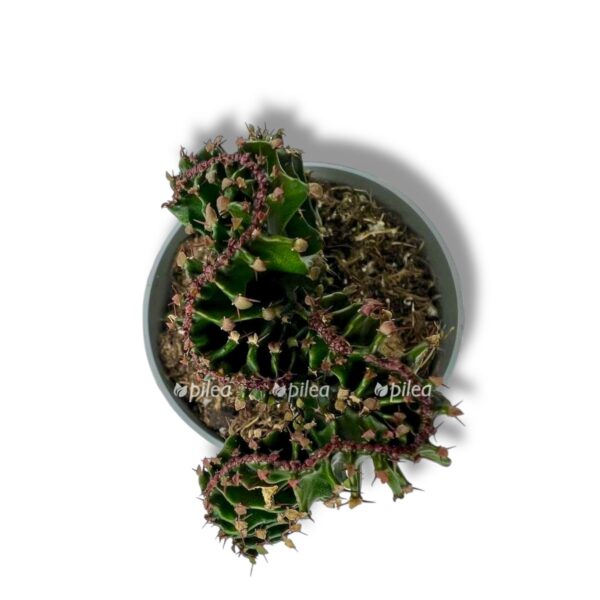 Эуфорбия Триангуларис Кристата — эффектный суккулент с необычной крестообразной (кристатной) формой роста. Растение представляет собой гребневидный «хребет» на основе стебля Euphorbia triangularis, который выглядит как живой архитектурный элемент. Его причудливые формы напоминают моллюски или кораллы, что делает растение заметным акцентом в интерьере.